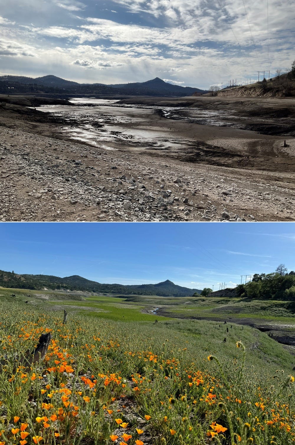 When the last dams were removed in Oregon and Northern California two years ago, the focus was pretty much exclusively on the return of the salmon. That surely was the most immediate and joyous things to see - the salmon are coming back! But riparian waterways had been devastated by decades of focus on dams and reservoirs. Now, all of whatβs been biodiversity-impoverished and/or left below artificial water levels, is given a leg up - and just marvel at the difference with the above two pics!